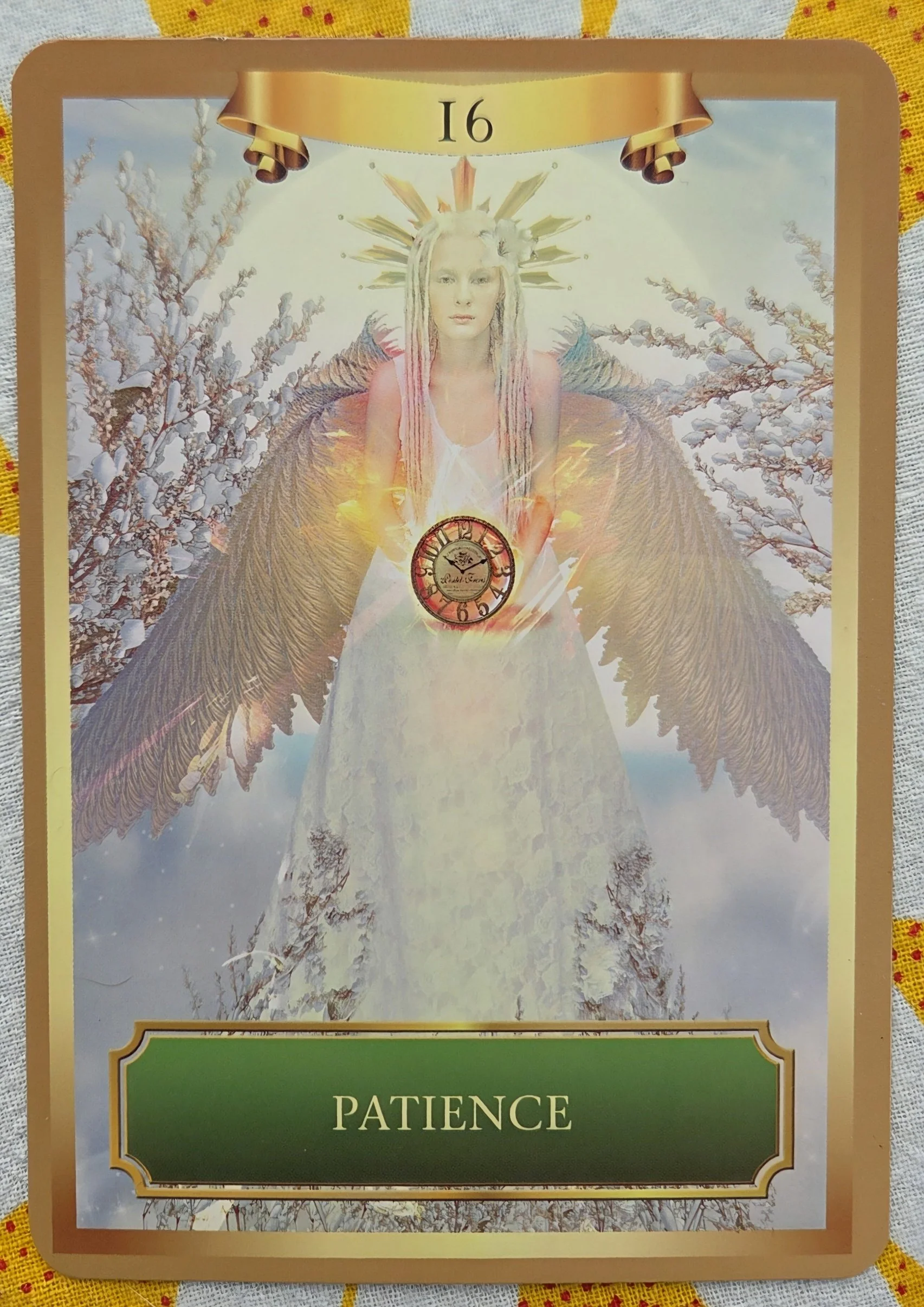 This card brings an angel holding a clock in the calm of winter. She brings a message of peaceful patience. Its time to release the old feelings of urgency and look at things with a clearer perspective.